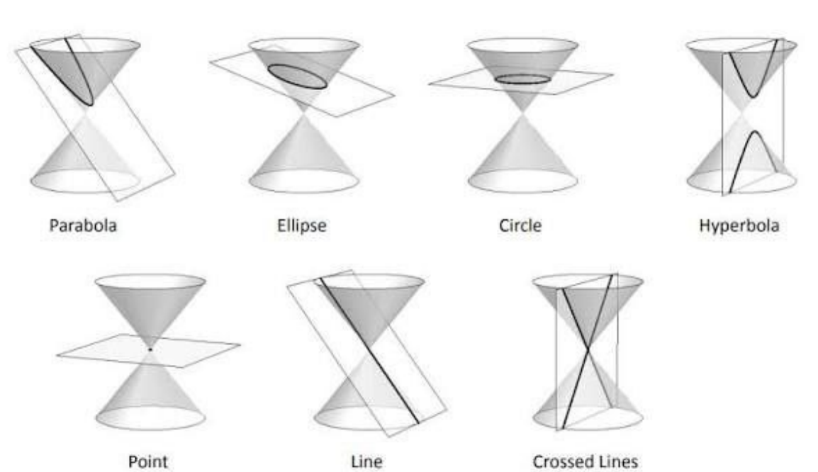 Conic sections are the curves you get when you intersect a plane with a double-napped cone. The type of curve—a circle, ellipse, parabola, or hyperbola—depends on the angle of the plane relative to the cone’s axis. In some special cases, called degenerate conics, the intersection can be a point, a line, or a pair of intersecting lines.