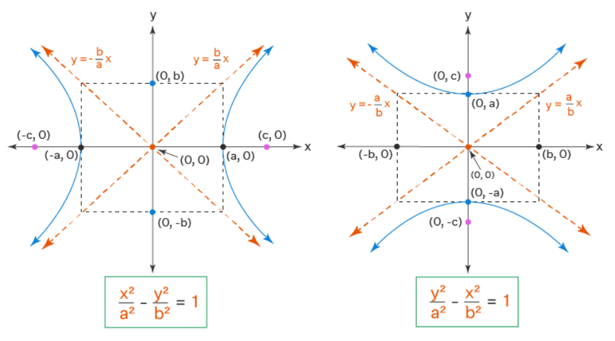 - Horizontal Transverse Axis: Branches open left and right. \[ \frac{(x - h)^2}{a^2} - \frac{(y - k)^2}{b^2} = 1 \]