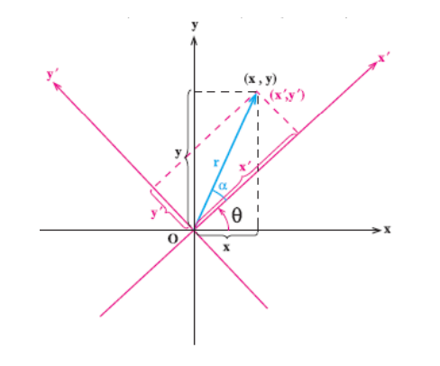 To analyze a conic section that has an \(xy\) term, we can rotate the coordinate axes to align with the conic’s axes. This eliminates the \(xy\) term, resulting in a simpler equation in a new coordinate system (\(x'\), \(y'\)).
