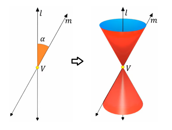 A cone is a three-dimensional geometric shape formed by a set of line segments connecting a common point, called the apex or vertex, to all the points on a flat base. For the purpose of conic sections, we consider a double-napped cone, which looks like two identical cones joined at their vertices. This shape is generated by rotating a straight line around a fixed axis line, where the rotating line intersects the axis.