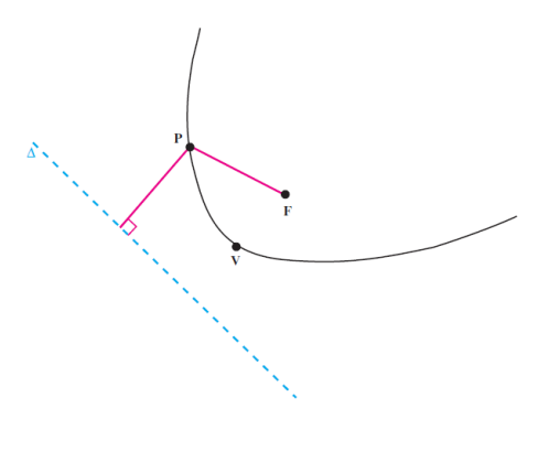 A parabola is the set of all points in a plane that are equidistant from a fixed point (the focus) and a fixed line (the directrix). The vertex of the parabola is the point on the parabola that is halfway between the focus and the directrix.