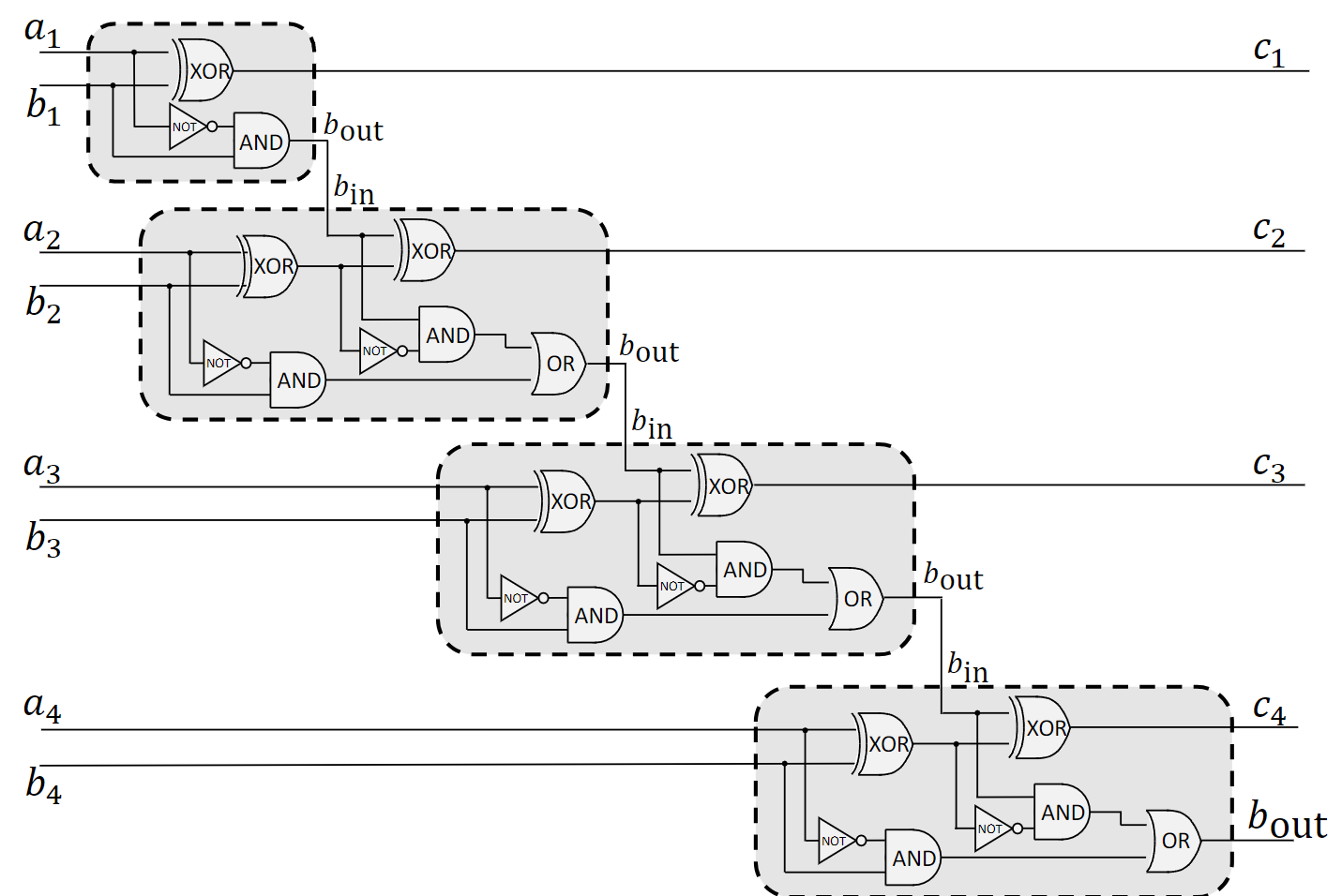 - Full-Subtractor: A circuit that subtracts three bits (two inputs and a borrow-in), producing a difference and a borrow.