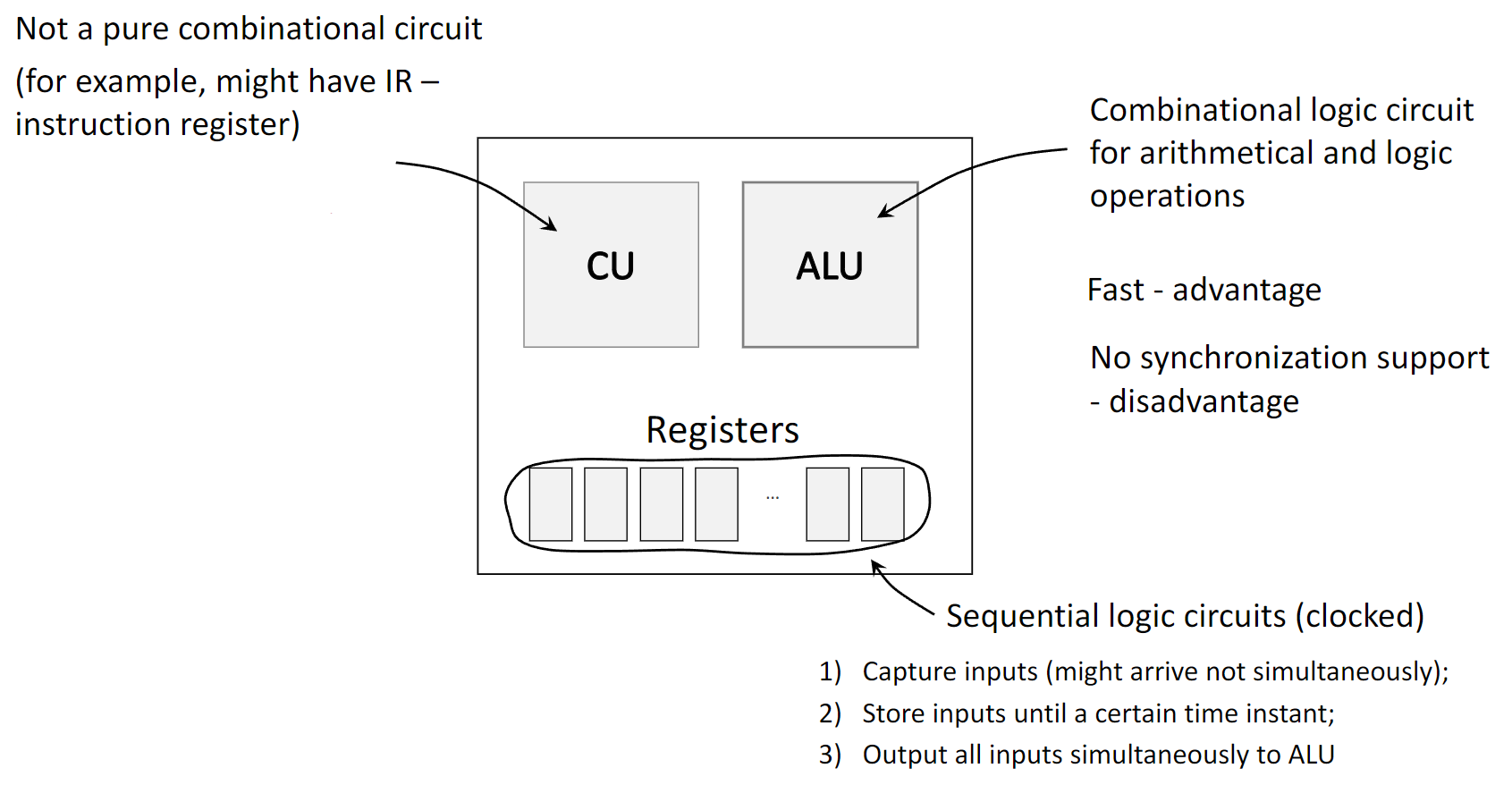 - Sequential Logic Circuits: These circuits do have memory and are controlled by a clock signal. Registers are sequential circuits used to store data temporarily. They solve the synchronization problem for the ALU by capturing input values (which may arrive at slightly different times) and holding them stable. On a clock signal, they output all inputs to the ALU simultaneously, ensuring a correct and stable calculation. The Control Unit (CU) is also a complex circuit that is not purely combinational.