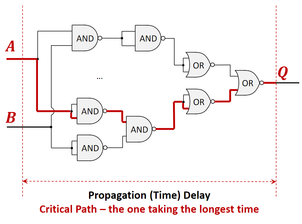 - Propagation Delay: The time it takes for a change at the input of a circuit to cause a change at its output. Every gate in a circuit introduces a small delay.