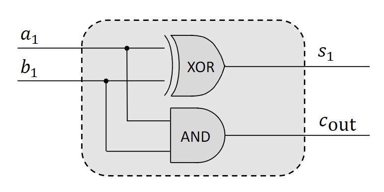 XORgate for the sum and anANDgate for the carry. It cannot accept a carry-in, so it is only suitable for the LSB position.