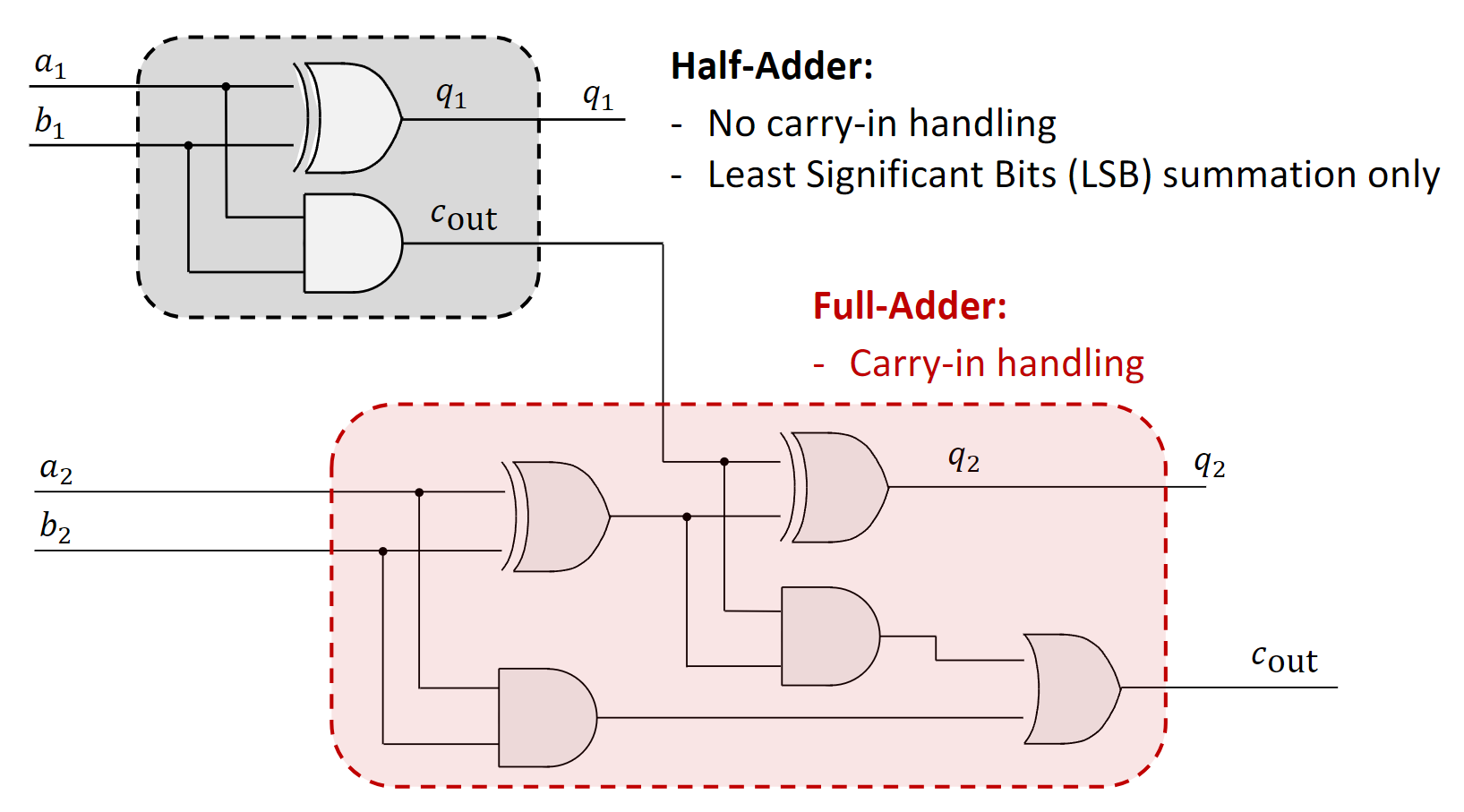 - Half-Adder: Adds two single bits, producing a Sum (S) and a Carry-Out (Cout). It uses an
