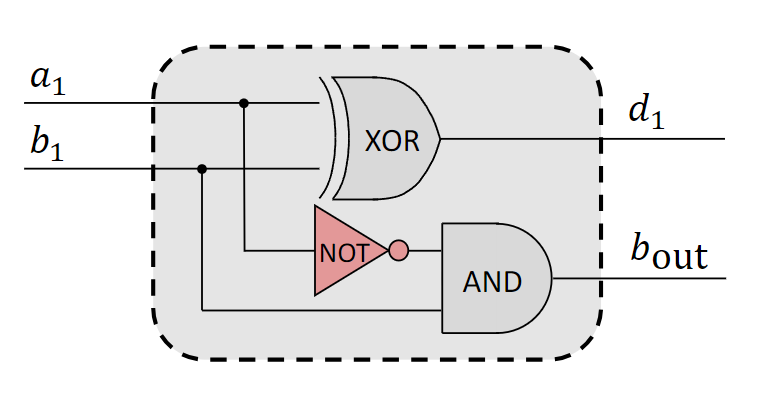AandB, and a borrow-inBin). It produces a Difference and a Borrow-Out, making it suitable for multi-bit subtraction.