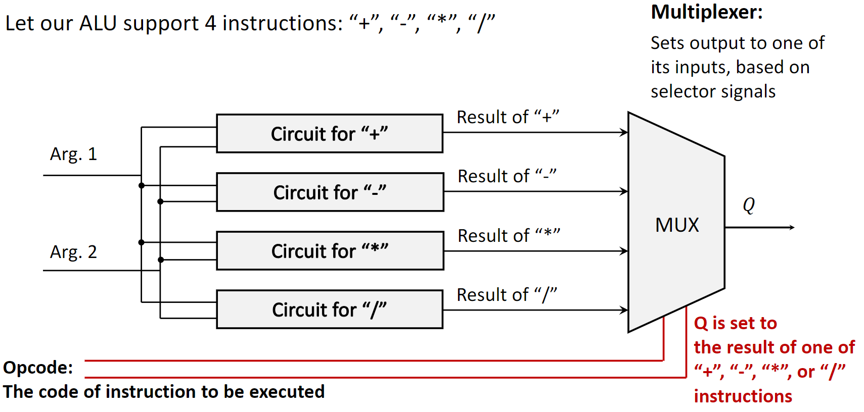 An ALU must perform multiple different operations. A practical way to design this is to have separate subcircuits for each operation (e.g., an adder, a subtractor, a multiplier). The inputs (arguments) are fed to all these subcircuits simultaneously. Each subcircuit computes its specific result.