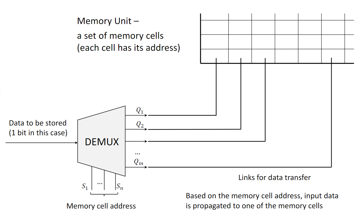 A demultiplexer is essential for writing data to a memory unit. A memory unit consists of many cells, each with a unique address. To write a bit of data to a specific cell: