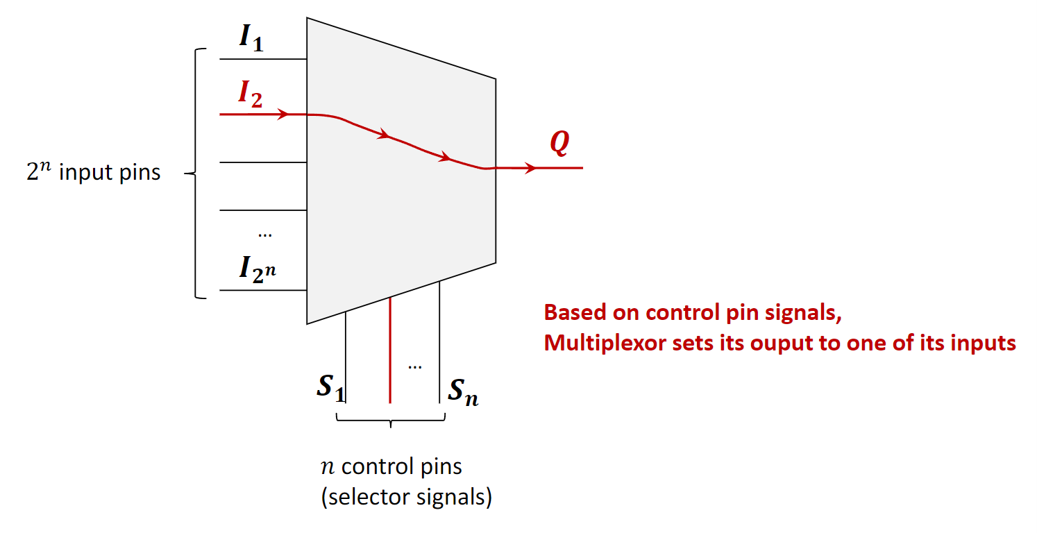 If a multiplexer has \(n\) control pins, it can select from up to \(2^n\) input lines. Think of it like a railroad switch: the control signals determine which track (input) gets connected to the main line (output).