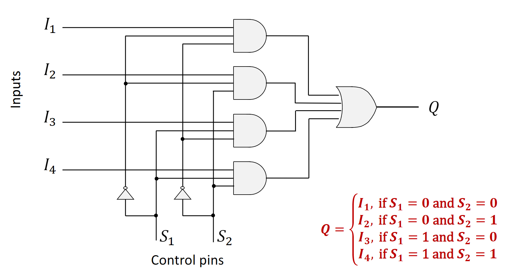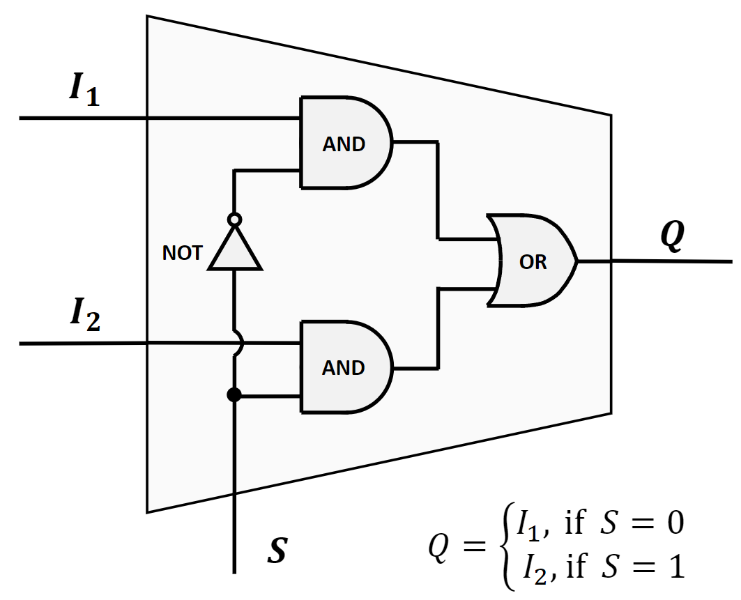 This logic is implemented using a combination of NOT, AND, and OR gates. The control signal \(S\) and its inverse (from the NOT gate) are used to “enable” one of the AND gates, allowing only one of the inputs to pass through to the final OR gate.