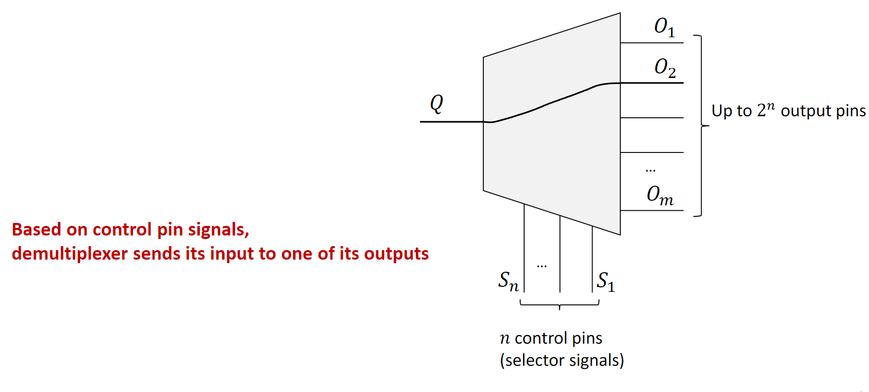A Demultiplexer (DEMUX) performs the reverse operation of a multiplexer. It takes a single input line and distributes it to one of several output lines. Similar to a MUX, a set of control pins determines which output line is selected. If there are \(n\) control pins, there can be up to \(2^n\) output lines.