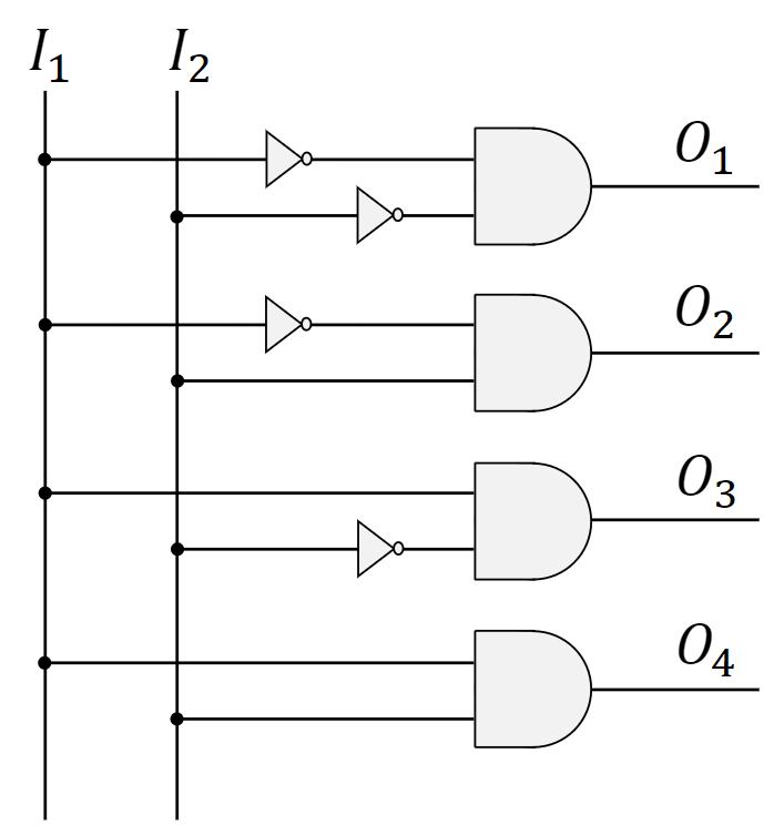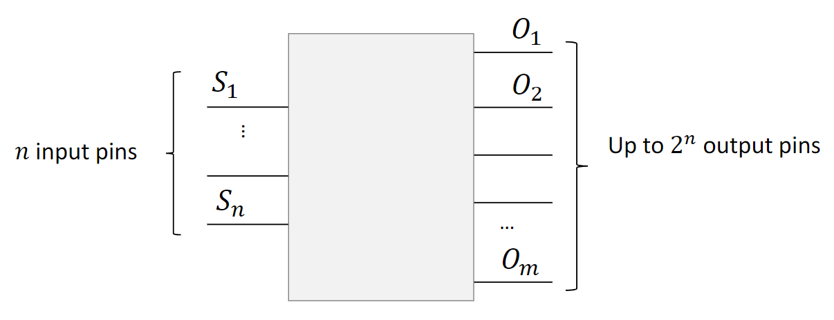 Essentially, a decoder with \(n\) input pins will have \(2^n\) output pins. It “decodes” the \(n\)-bit binary input to activate a single, corresponding output.