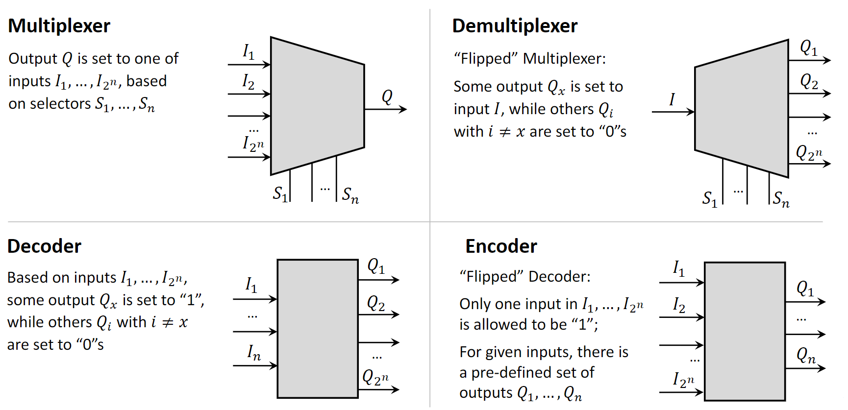 - Multiplexer (MUX): A circuit with multiple data inputs, one data output, and control inputs that select which data input is routed to the output.