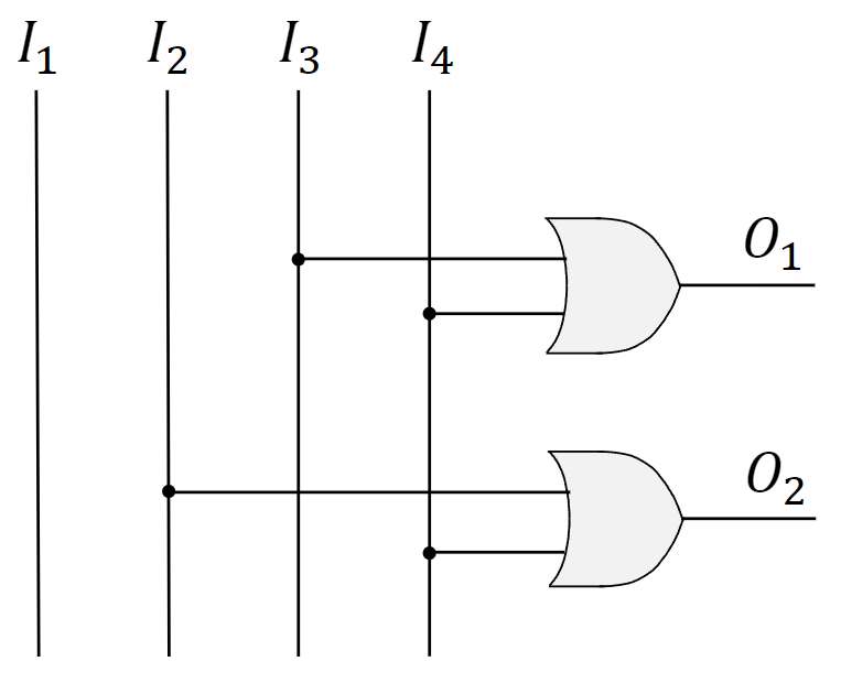 A 4-to-2 encoder has four input lines (\(I_1, I_2, I_3, I_4\)) and two output lines (\(O_1, O_2\)). Assuming only one input is 1 at a time, it generates a two-bit output. The implementation for this simple encoder surprisingly only requires two OR gates.