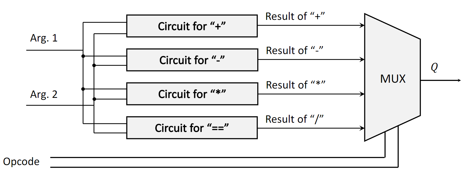 Arg. 1,Arg. 2) are fed in parallel to four distinct circuits. - Each circuit computes its specific function: one for addition, one for subtraction, etc.