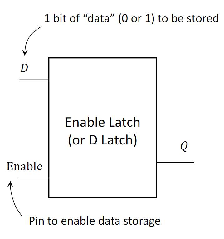 To solve the illegal input problem of the SR latch, the D Latch (Data Latch or Enable Latch) was developed. It has two inputs: D (Data) and E (Enable).