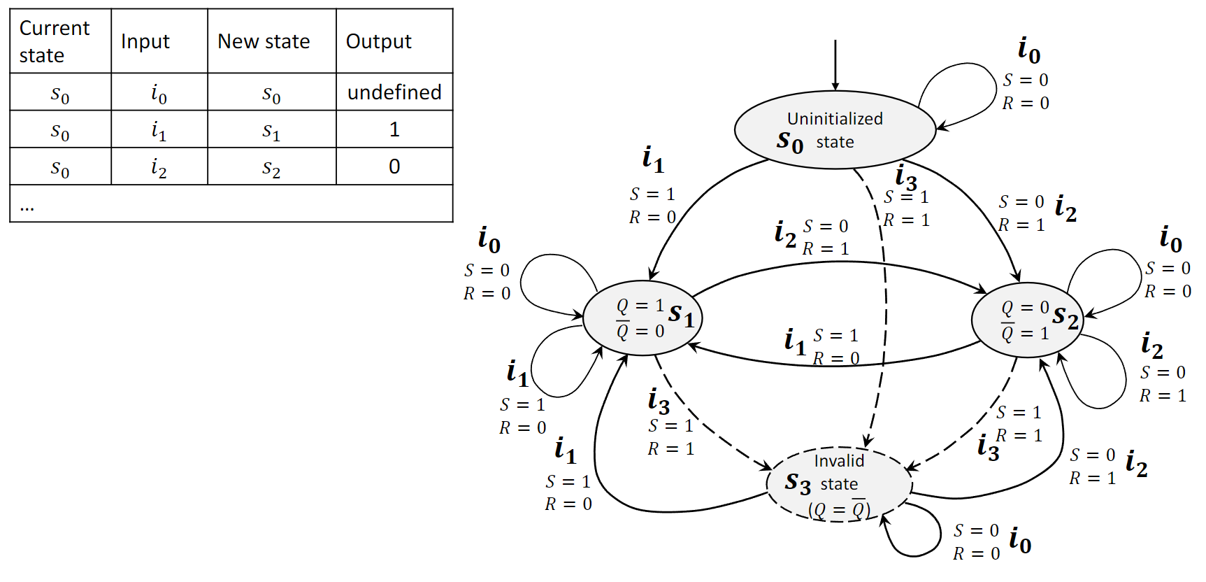 uninitialized). - Inputs (\(I\)): A finite set of input signals the machine can receive (e.g., the four possible combinations of S and R).