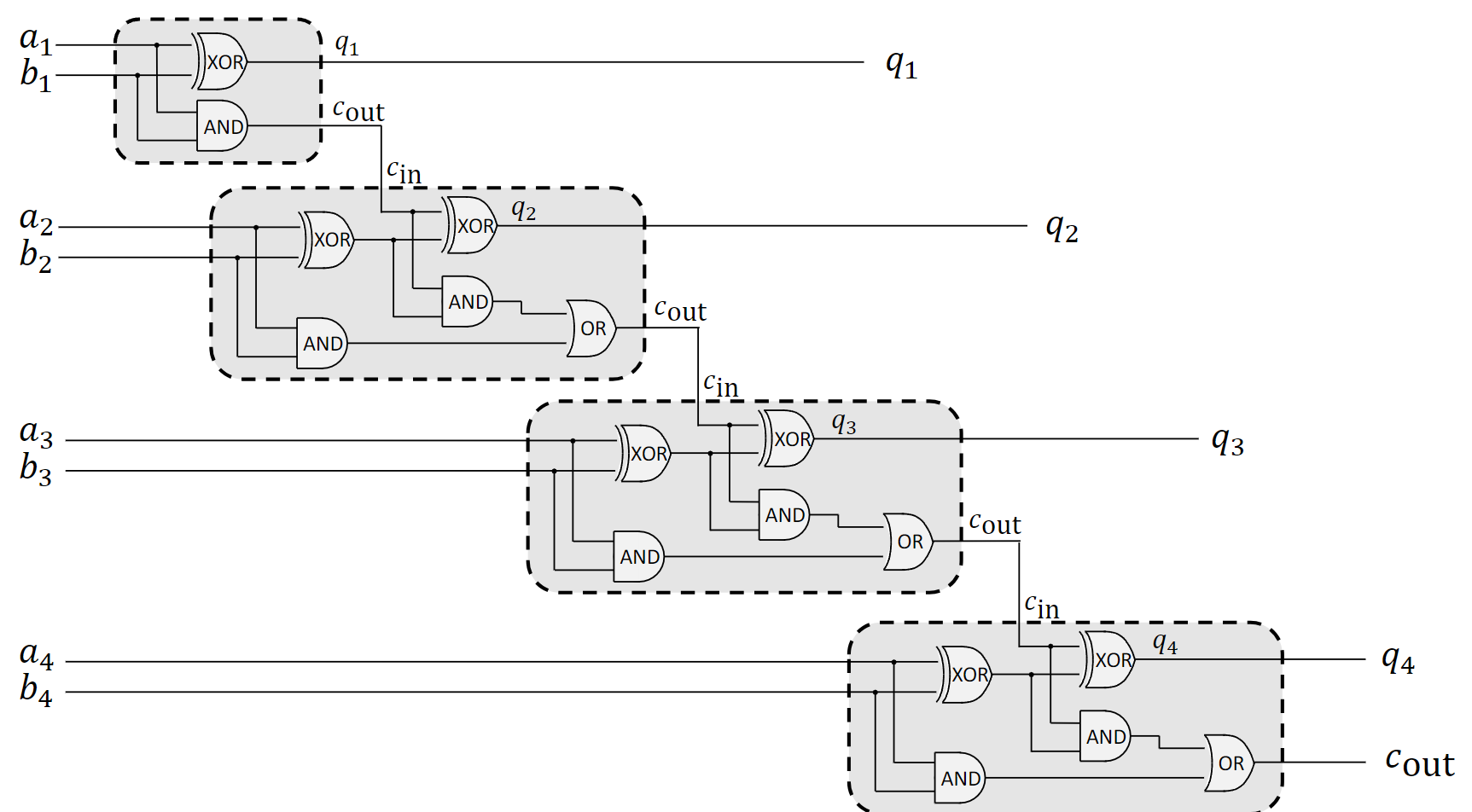 - Ripple-Carry Adder: For a 4-bit adder (e.g., adding \(A_4A_3A_2A_1\) and \(B_4B_3B_2B_1\)), four full adders are connected in series.