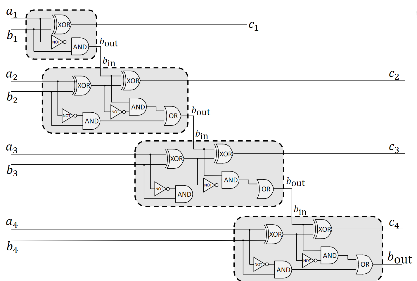 Subtraction in binary can be performed by adding the two’s complement of the subtrahend. A 4-bit subtractor can be built using a 4-bit adder with a slight modification. To calculate \(A - B\), we compute \(A + (\text{two's complement of } B)\).