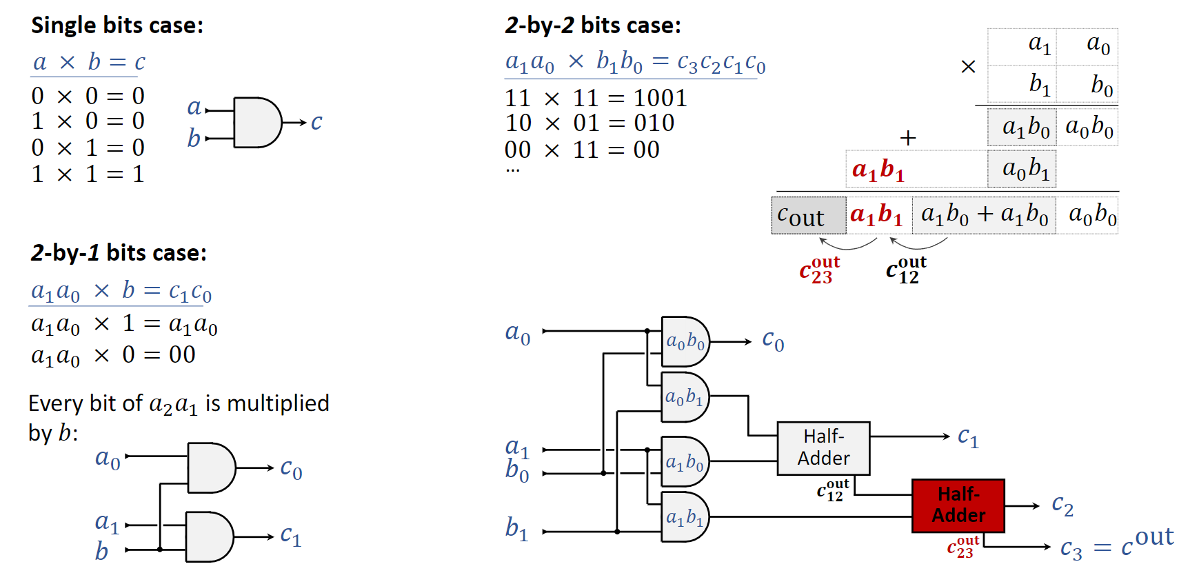 - Single-Bit Case: Multiplying two single bits, \(a \times b\), is equivalent to the logical AND operation. The result is 1 only if both \(a\) and \(b\) are 1. The circuit for this is a single AND gate.