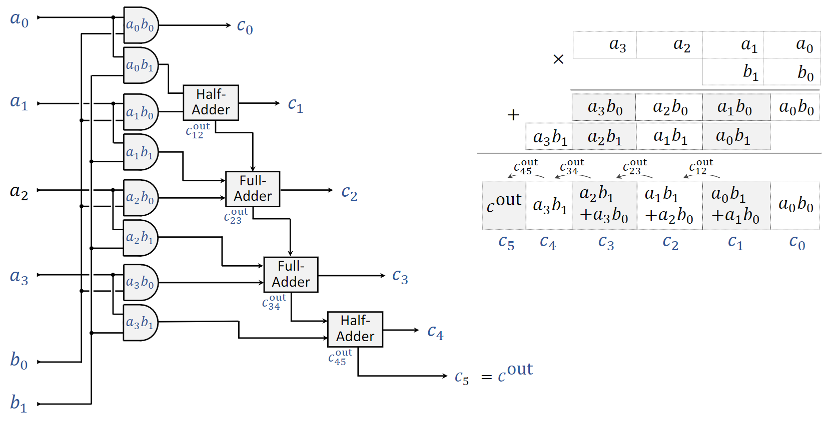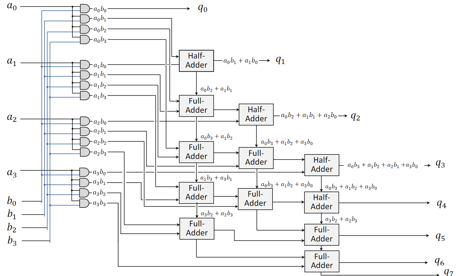 - Partial Product Generation: An array of 16 AND gates is used to compute all the partial products (\(a_ib_j\) for \(i,j \in \{0,1,2,3\}\)).