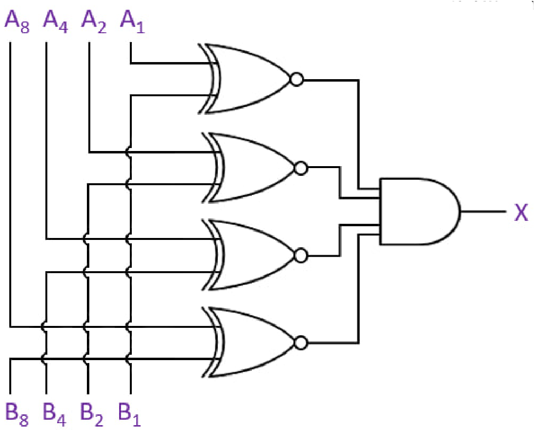- The final output of the AND gate will be 1 only if all four XNOR gates output 1, which means all bit pairs are identical.