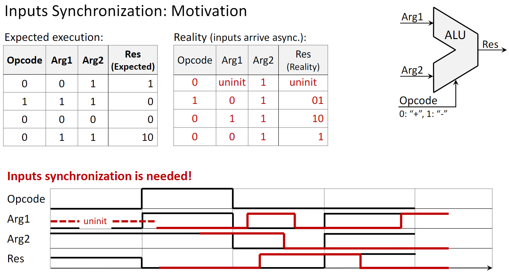 In a real-world system like a CPU, different input signals for a component like an ALU might arrive at slightly different times due to varying path lengths and component delays. This is called input skew. If an ALU (a combinational circuit) processes these unsynchronized inputs as they arrive, it can produce incorrect, glitchy outputs before the inputs stabilize.