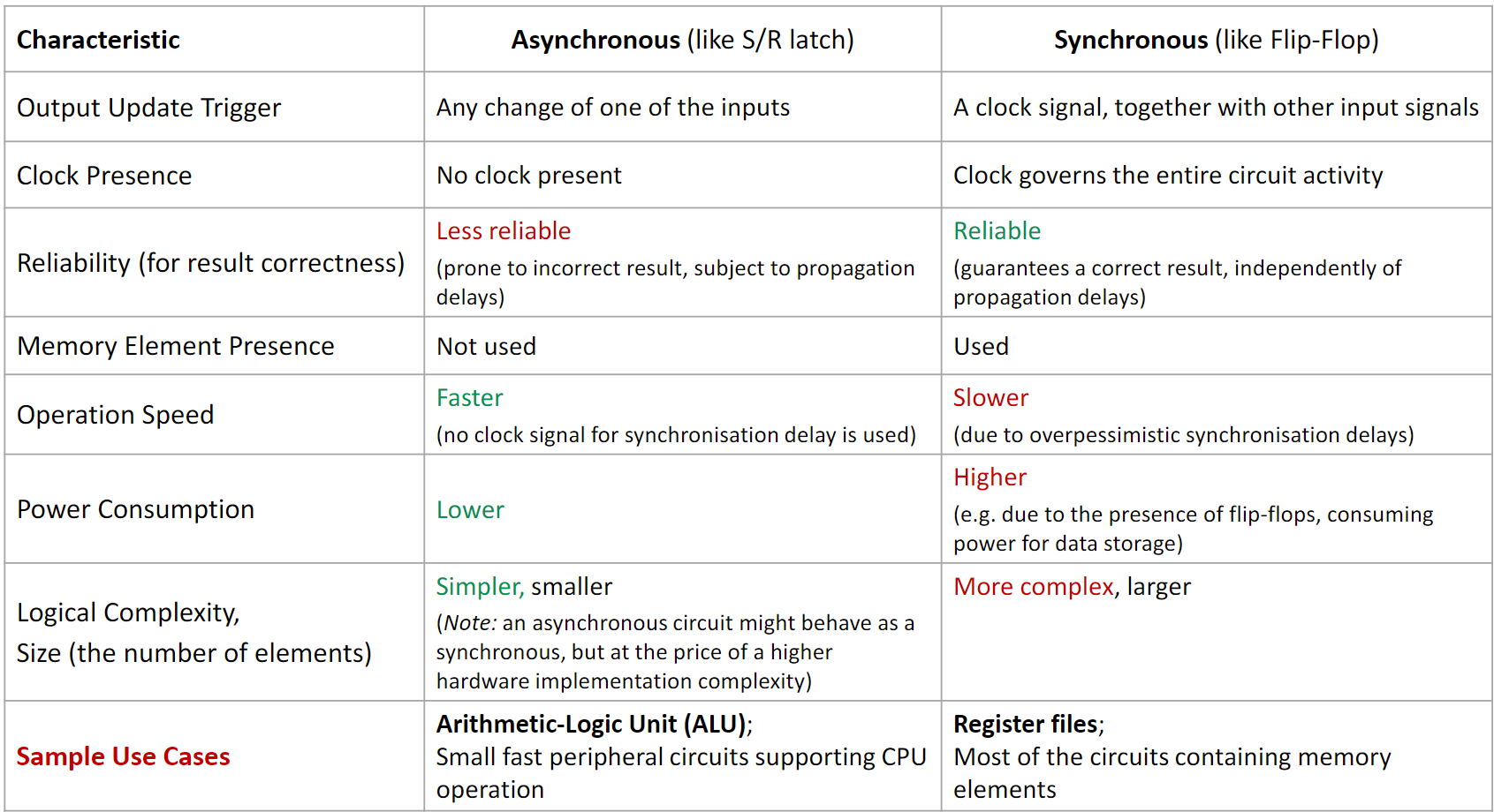 - Use Cases: Most modern digital systems, including CPU chips and register files, are synchronous because they are more reliable and easier to design and debug. A Flip-Flop is the fundamental synchronous memory element.