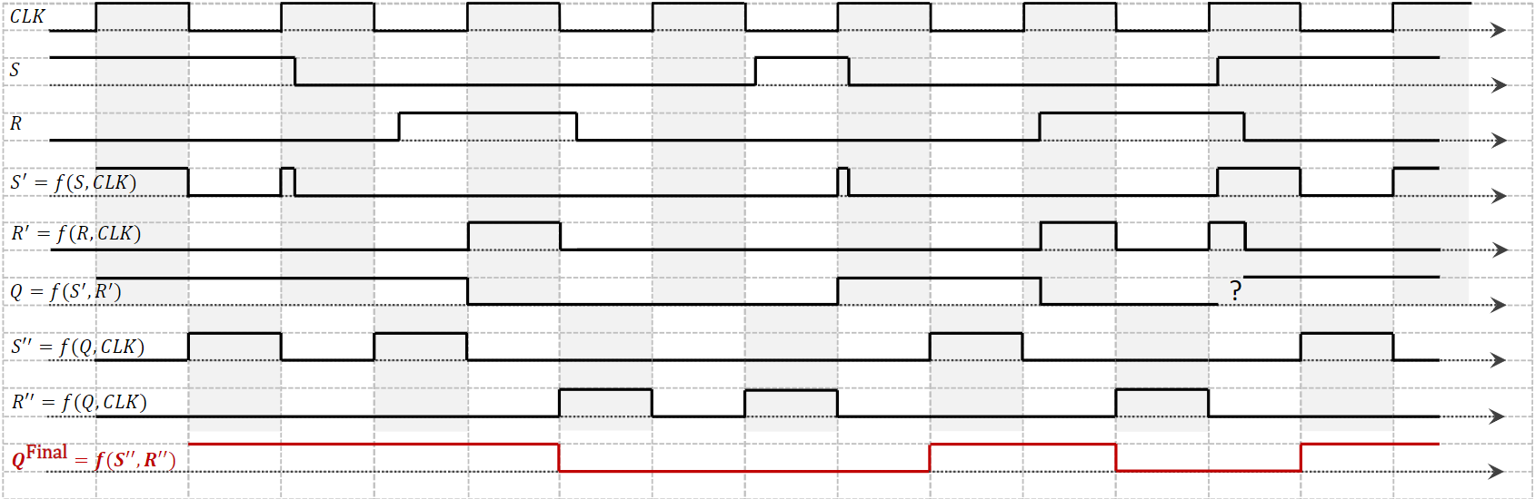 - Clock is High (Asserted): The master latch is enabled and accepts the external S and R inputs. The slave latch is disabled and holds the previous output value.