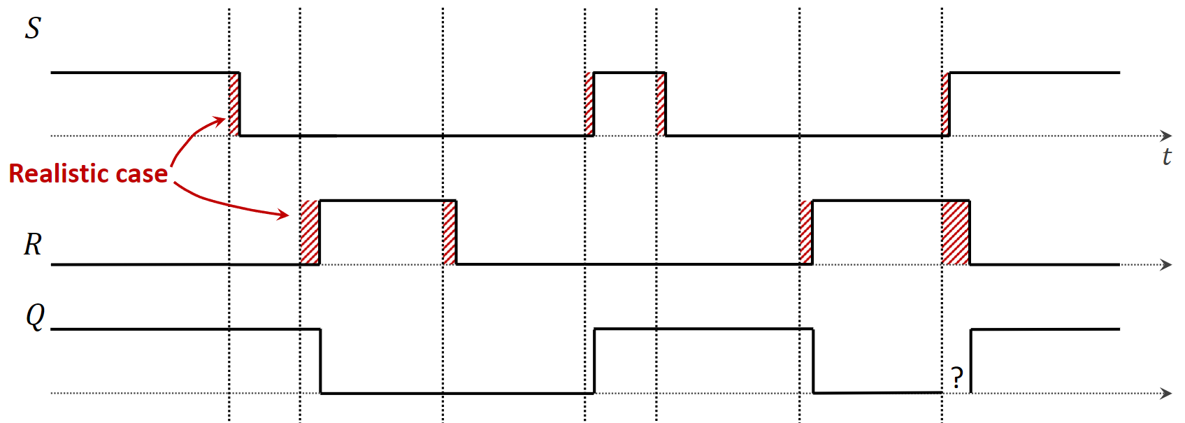 A major problem with the S/R Latch is its vulnerability to propagation delays. If inputs S and R are meant to change simultaneously but one is slightly delayed, the latch might momentarily enter the illegal state, causing errors.