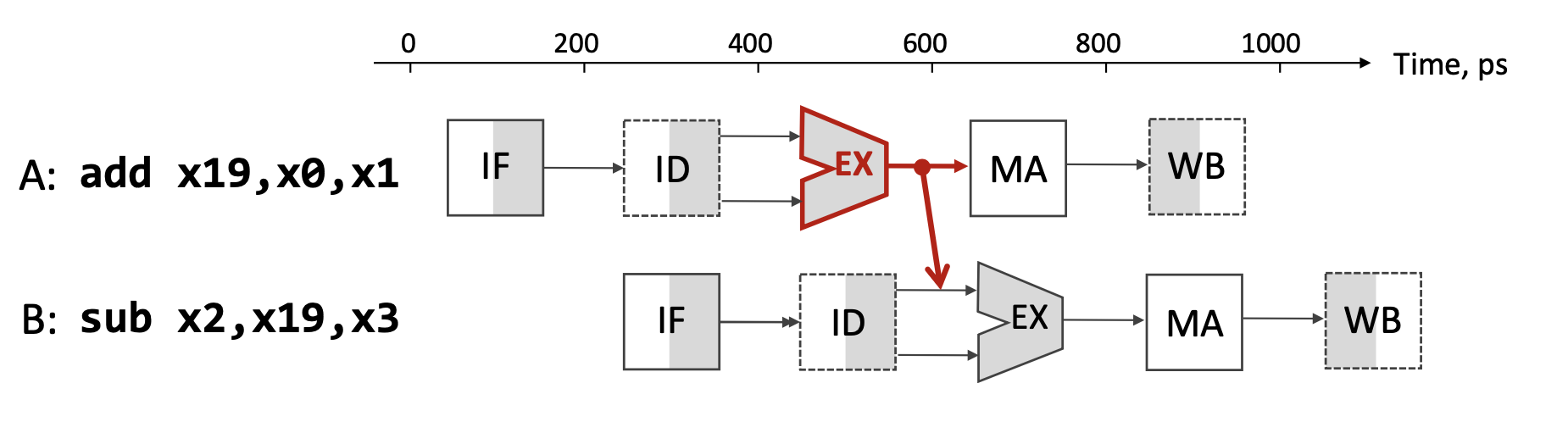 • Instruction B needs x19 in its ID stage (clock cycle 3) and EX stage (clock cycle 4)