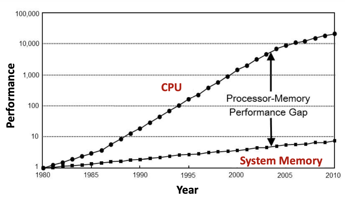 The graph above illustrates this critical problem: by 2010, CPUs had become approximately 10,000 times faster than they were in 1980, while system memory had only improved by a factor of about 7. This gap means that even the fastest CPU must frequently wait for data from relatively slow main memory, creating a severe performance bottleneck.