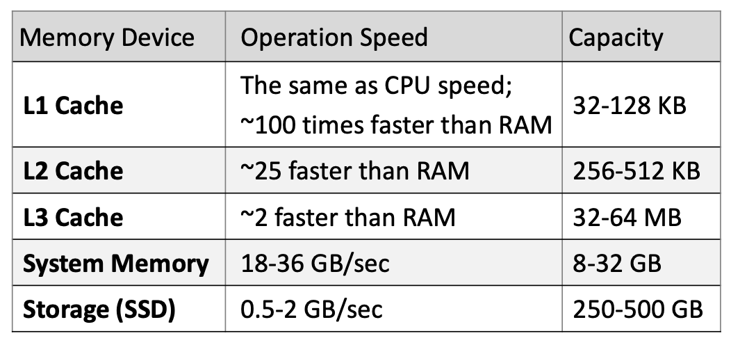• Storage (SSD): 0.5-2 GB/sec transfer rate, capacity 250-500 GB