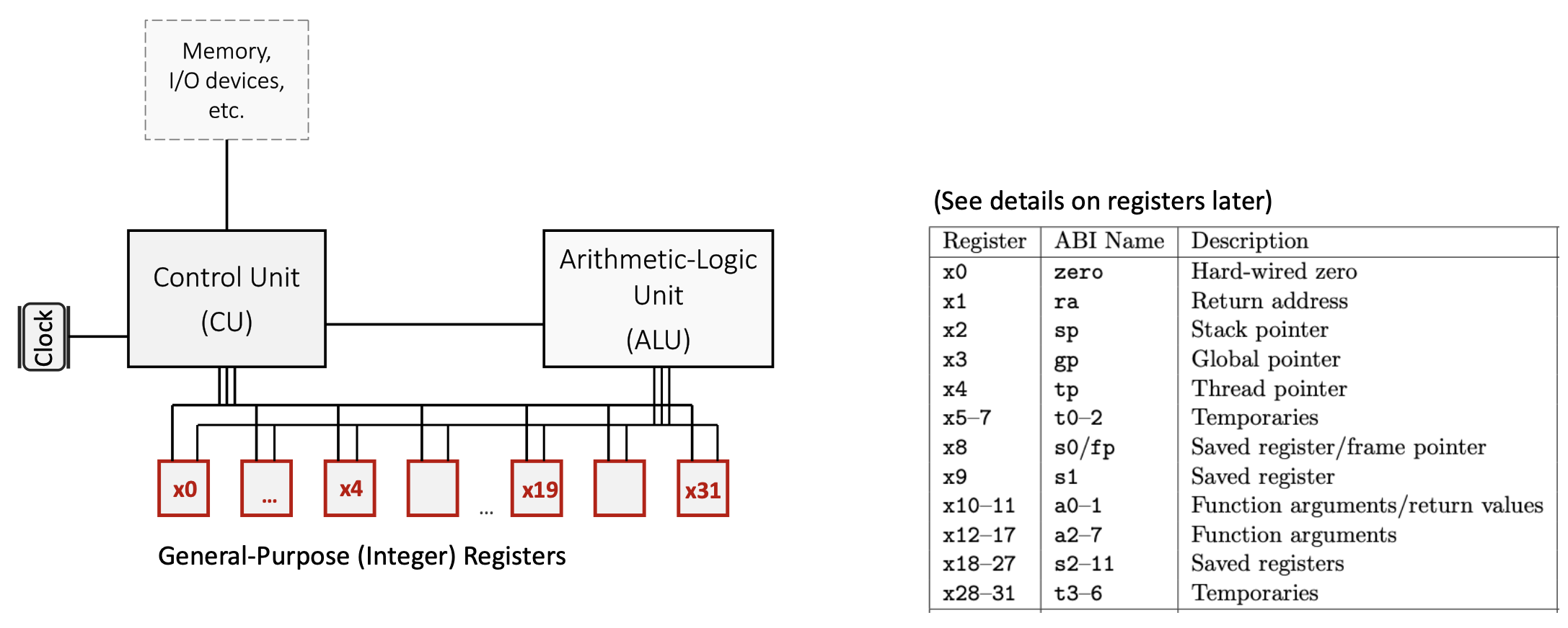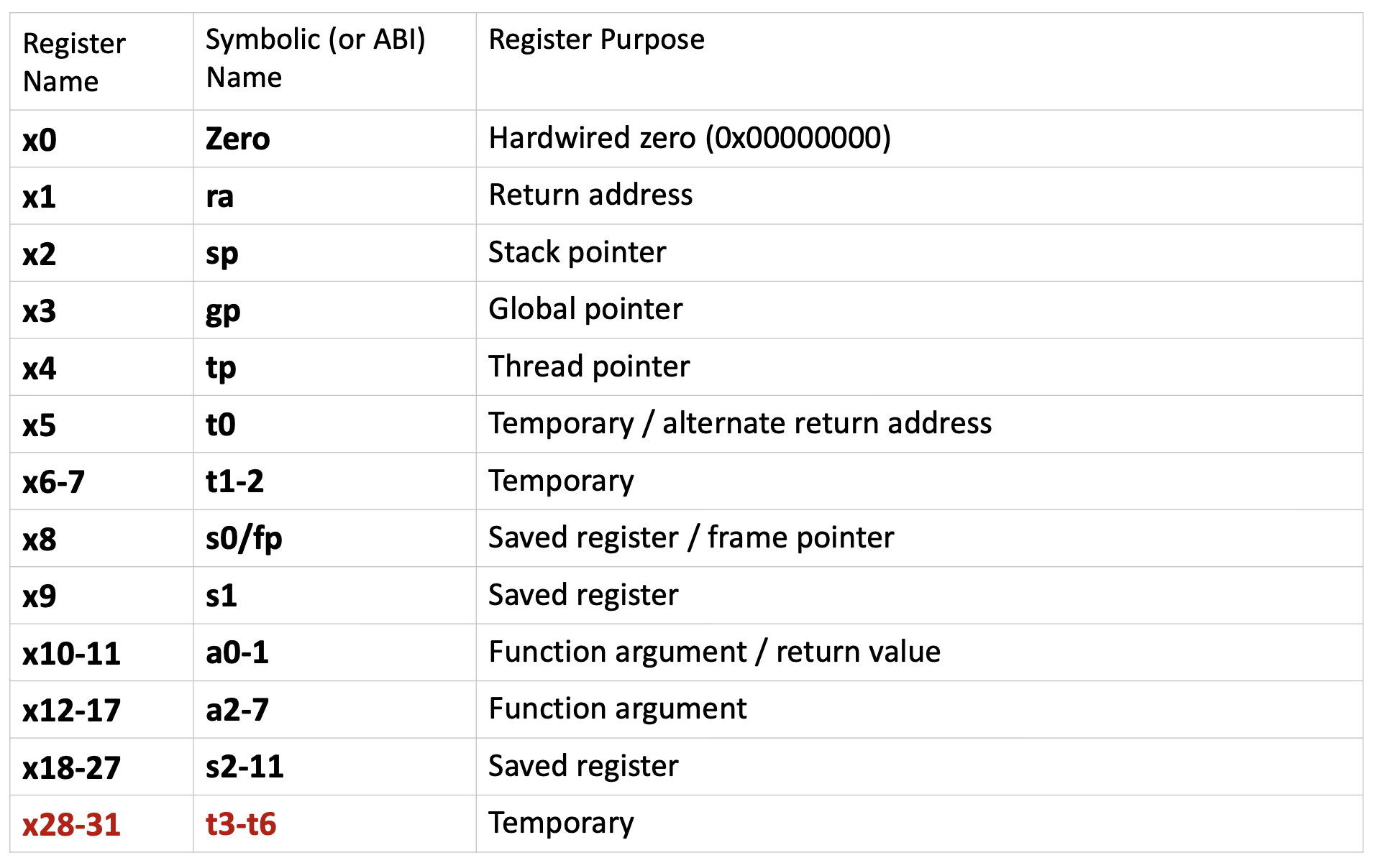 x0(zero): A special register hardwired to the constant value 0. Writing to this register has no effect, and reading from it always returns 0. This is useful for operations like copying values (by adding zero) or implementing NOP (no operation) instructions.- Temporary registers (