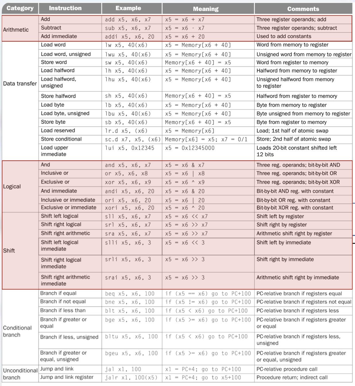 slli,srli,sraiuse a constant shift amount (e.g.,slli x5, x6, 3computesx5 = x6 << 3).