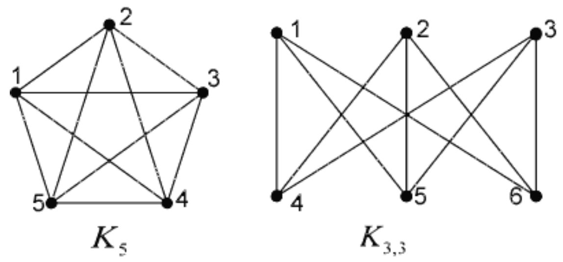 This theorem tells us that \(K_5\) and \(K_{3,3}\) are the “minimal” non-planar graphs—every non-planar graph must contain one of them (or their subdivisions) as a subgraph.
