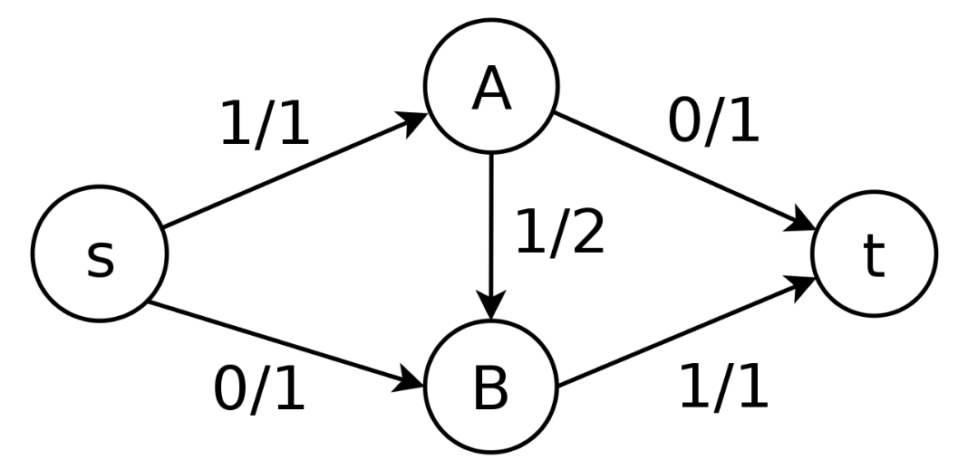 - \(A\) forwards that 1 unit through \(B\) to reach sink \(t\)