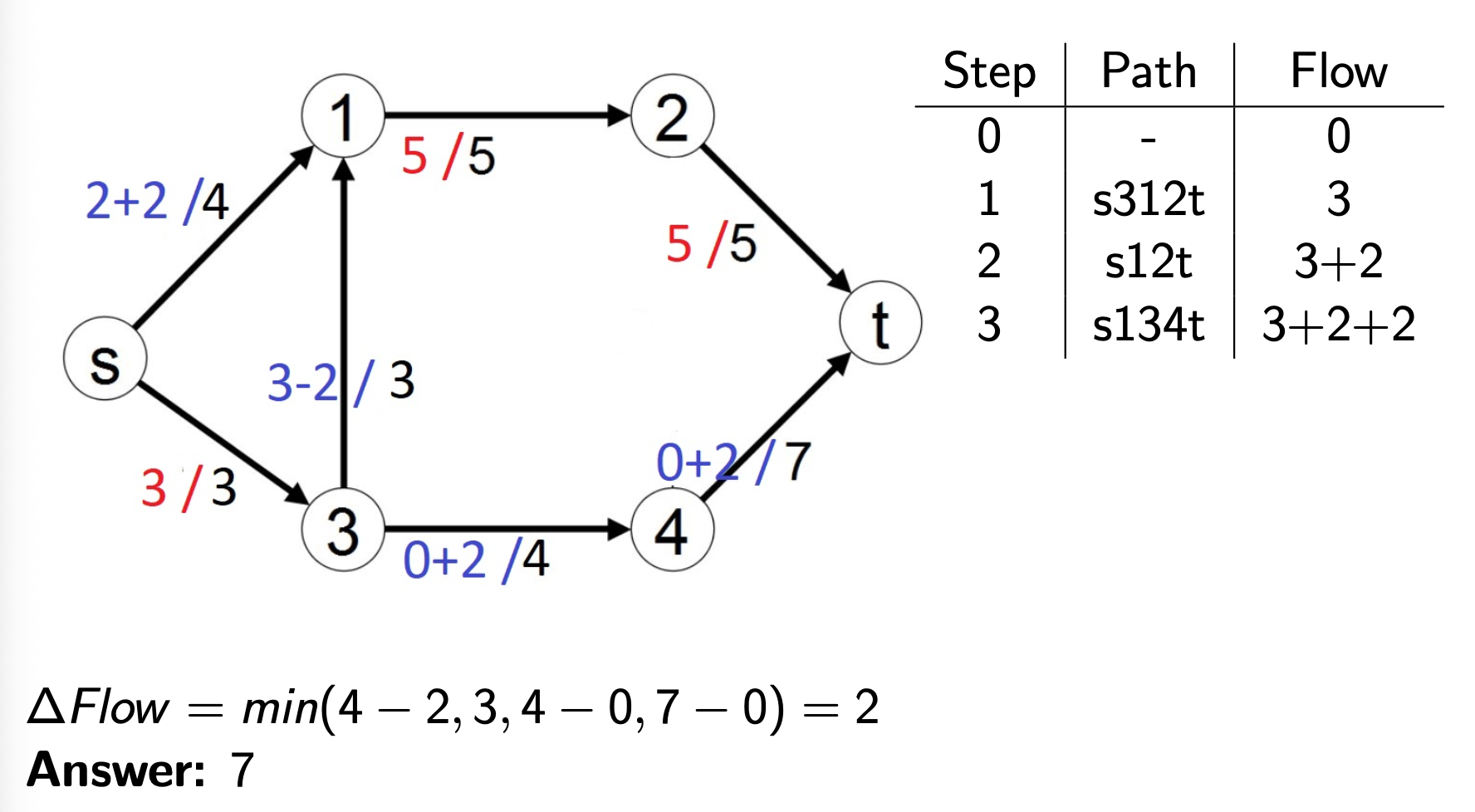 - Flow value: \(\Delta\text{Flow} = \min(4-2, 3, 4-0, 7-0) = 2\)