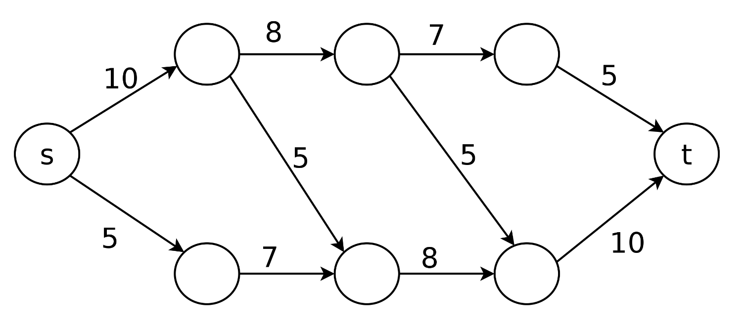 2. Conservation of Flow: For every vertex \(v \in V \setminus \{s, t\}\) (all vertices except source and sink): \[\sum_{w \in V} f(v, w) = \sum_{w' \in V} f(w', v)\] This means “what flows in must flow out” - the total flow entering a vertex equals the total flow leaving it. The source and sink are exceptions: the source only produces flow, the sink only consumes it.