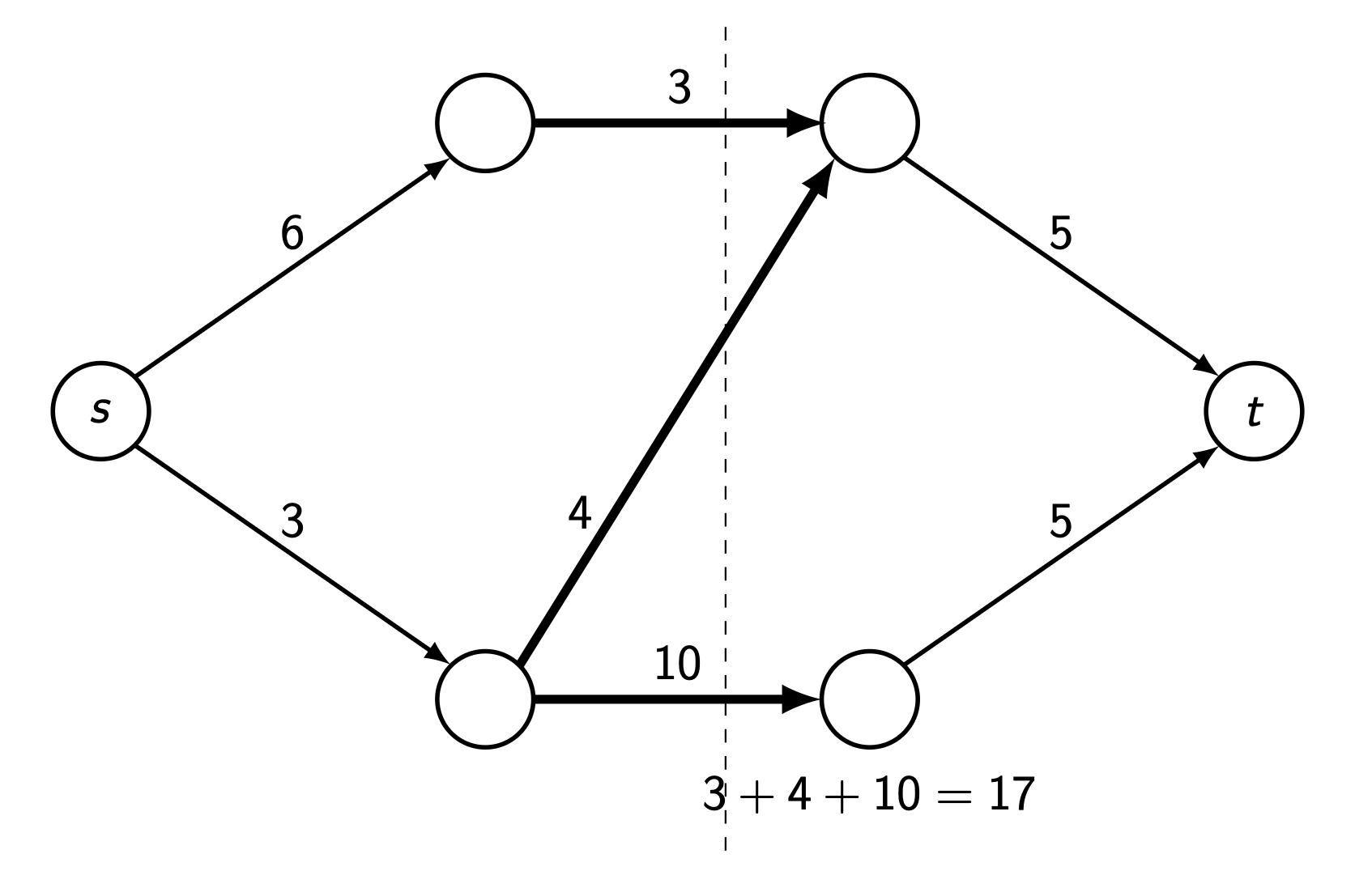 - Cut 2 (middle vertical): Cuts edges with capacities \(3 + 4 + 10 = 17\)