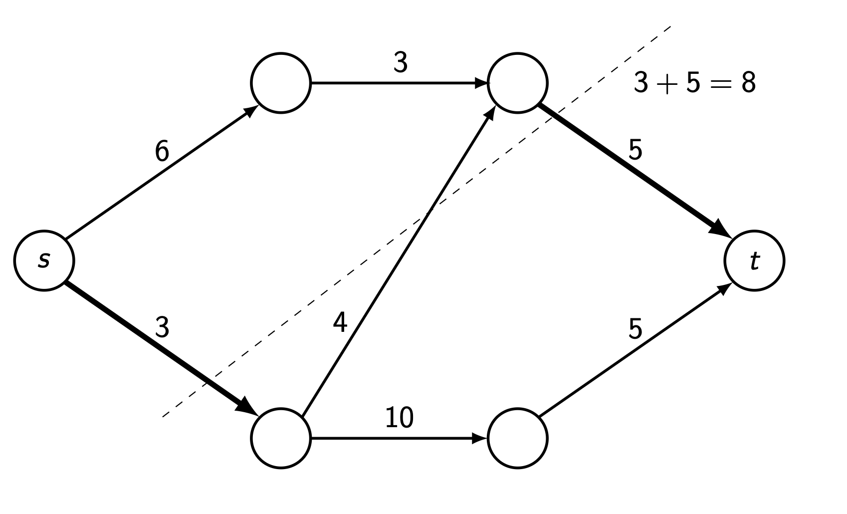 Intuitively, a cut is like drawing a line through the network that separates the source side from the sink side. The cut consists of all edges crossing that line.