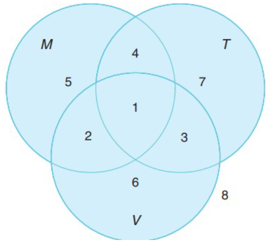 - \(|F \cup B \cup V| = |F| + |B| + |V| - (|F \cap B| + |F \cap V| + |B \cap V|) + |F \cap B \cap V|\)