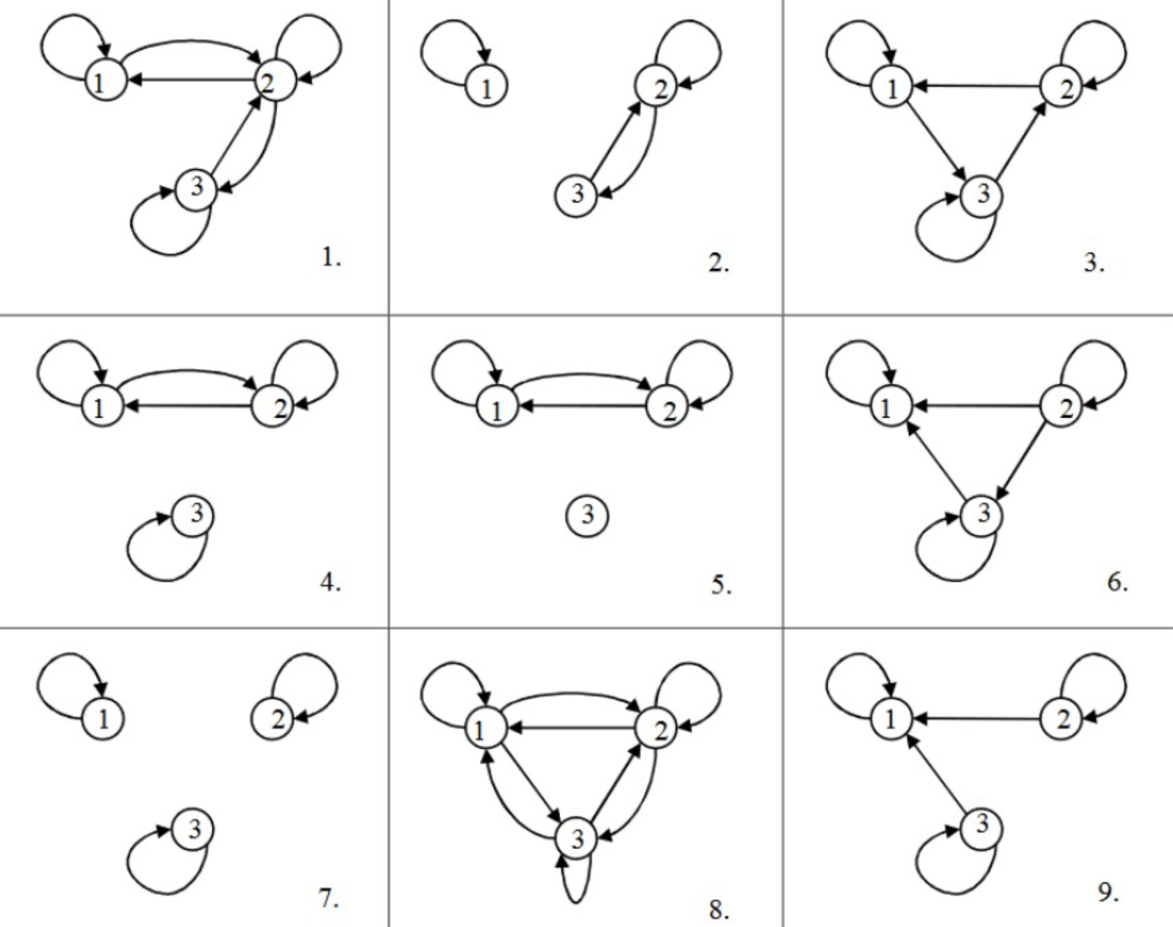 - Count subsets: Any binary relation is a subset of \(X \times X\). A set with \(n^2\) elements has \(2^{n^2}\) subsets (each element can be either included or excluded independently).