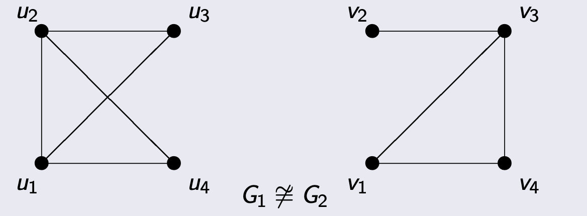 - Find a bijection: Notice \(G_1\) is a “crossed square” and \(G_2\) is a standard square (\(C_4\)). We can “uncross” \(G_1\). Try the mapping: \(\phi: u_1 \to v_1, u_2 \to v_3, u_3 \to v_2, u_4 \to v_4\).