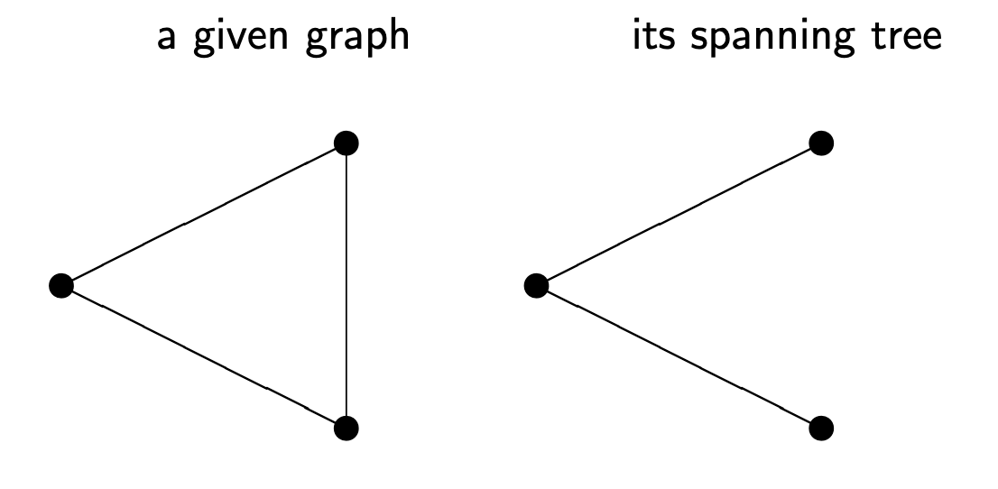 - Spanning tree: \(v_T = 4\) vertices, \(e_T = 3\) edges.