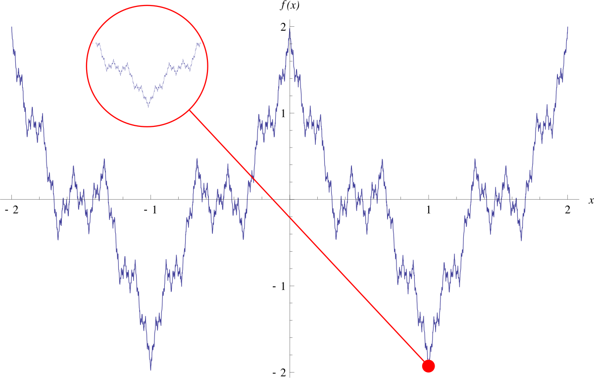 where \(p \in \mathbb{N}\), \(0 < a < 1\), and \(ab \ge 1\). This function is continuous everywhere but has no derivative at any point - its graph is so jagged and irregular that it has no tangent line anywhere!